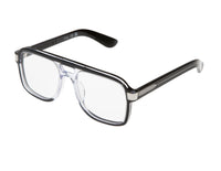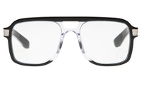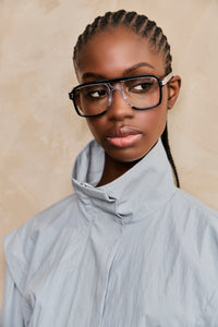 #spitfirecut: optical grade frames cut from Cellulose block Acetate with premium nylon, Anti-reflective Lenses & Ultra Violet protection. Aviator, two tone frames in black and clear with blue light blocking lenses. Ships with Custom Sunglass Case and microfiber cloth.
