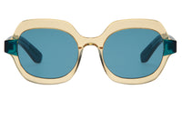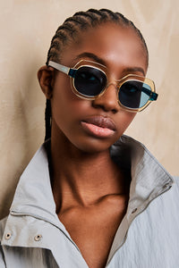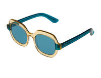 #spitfirecut: optical grade frames cut from Cellulose block Acetate with premium nylon, Anti-reflective Lenses & Ultra Violet protection. Oversize, geometric frames in tan with turquoise arms & lenses. Ships with Custom Sunglass Case and microfiber cloth.